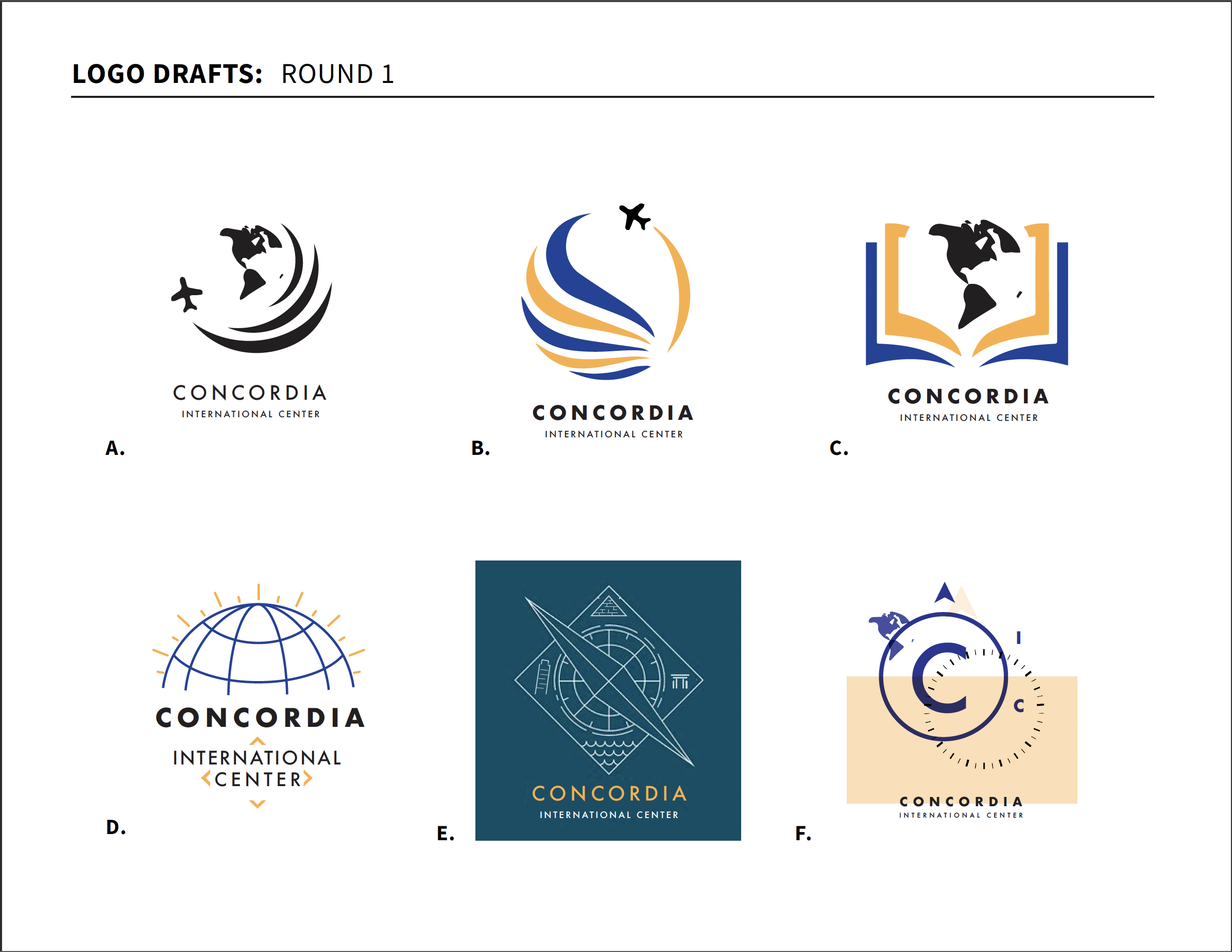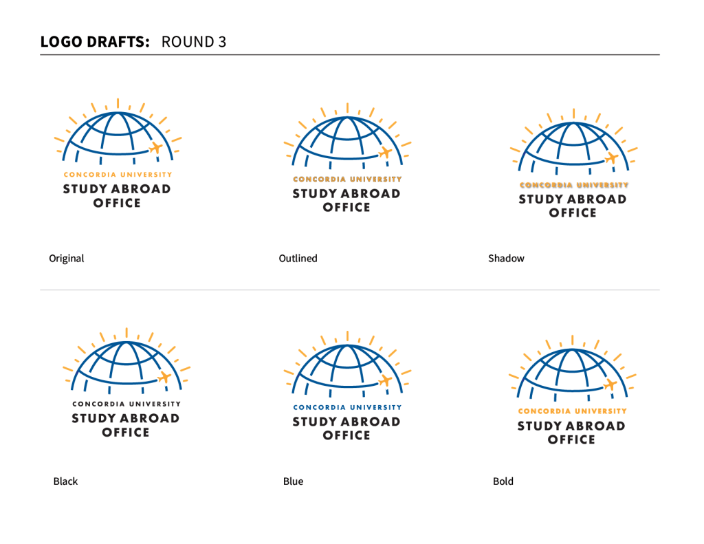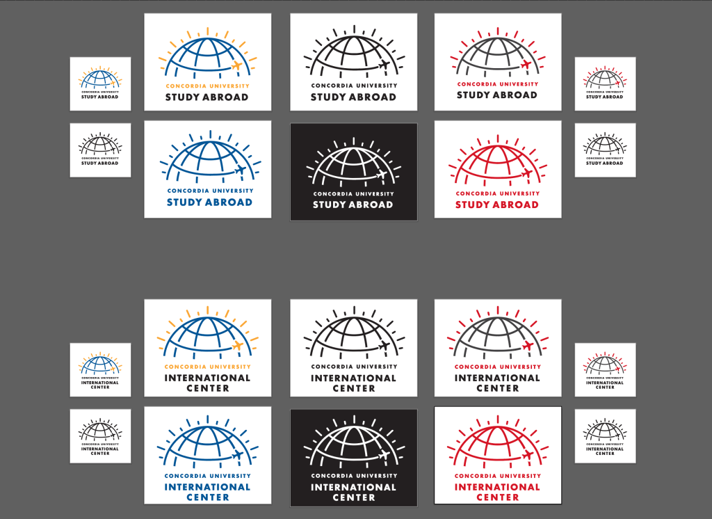 The final logo package included large and small logos for the Study Abroad office (outgoing) and International Center (incoming) at both Concordia University Mequon (blue and yellow) and Ann Arbor (red and black).